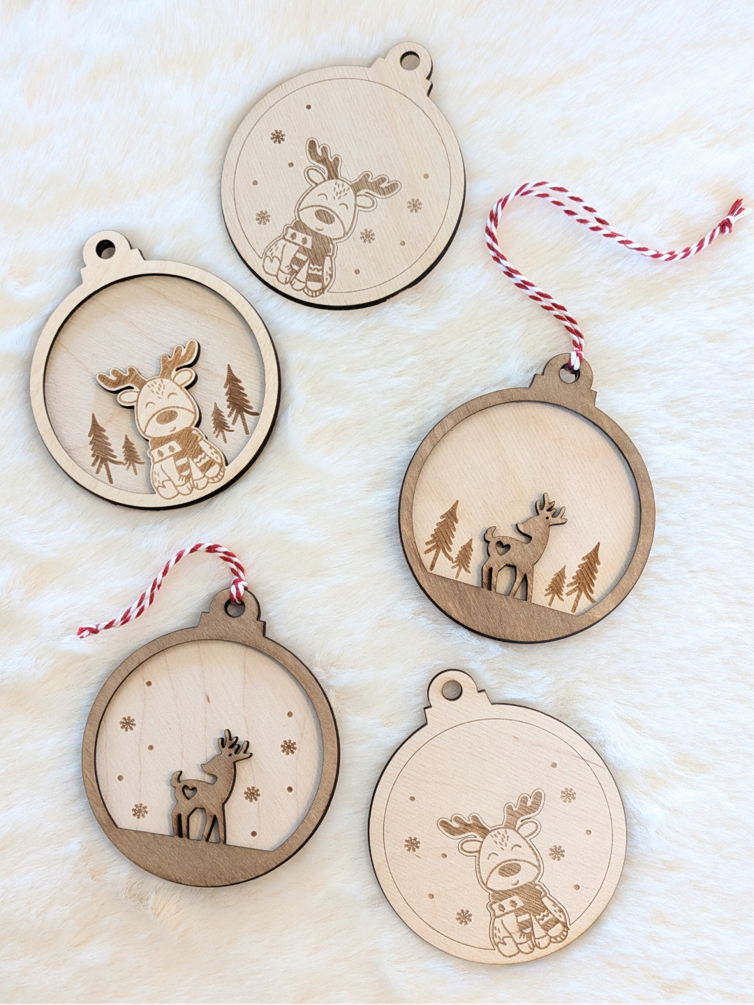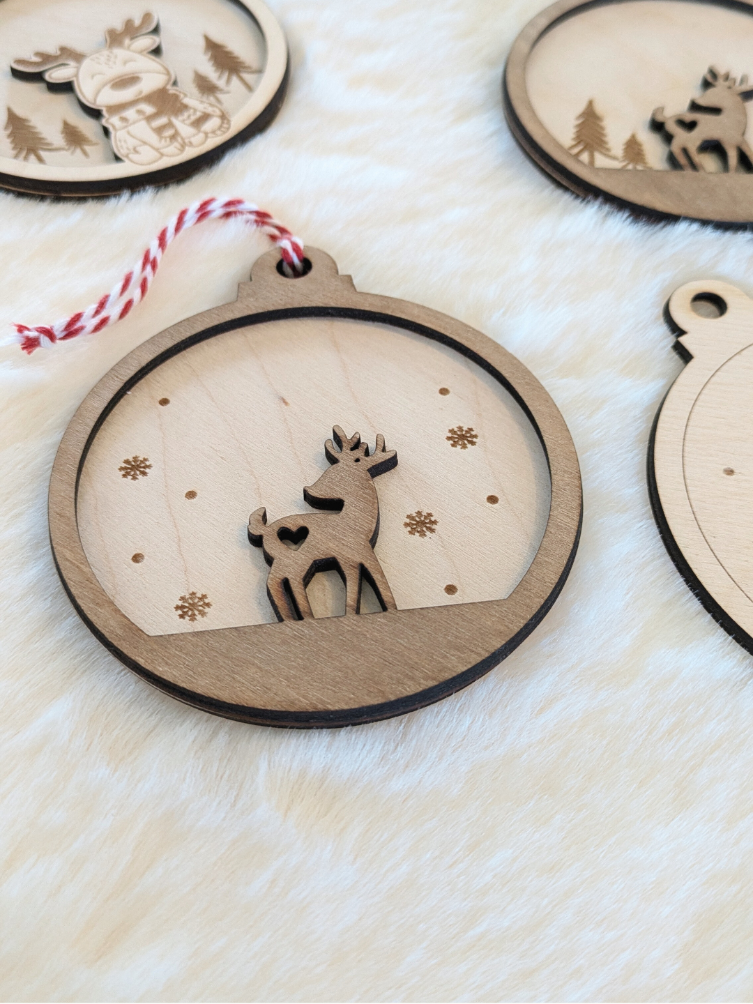 Apportez une touche de tendresse et de poésie à votre sapin avec cette boule en bois représentant un petit renne délicatement gravé, entouré de flocons de neige.