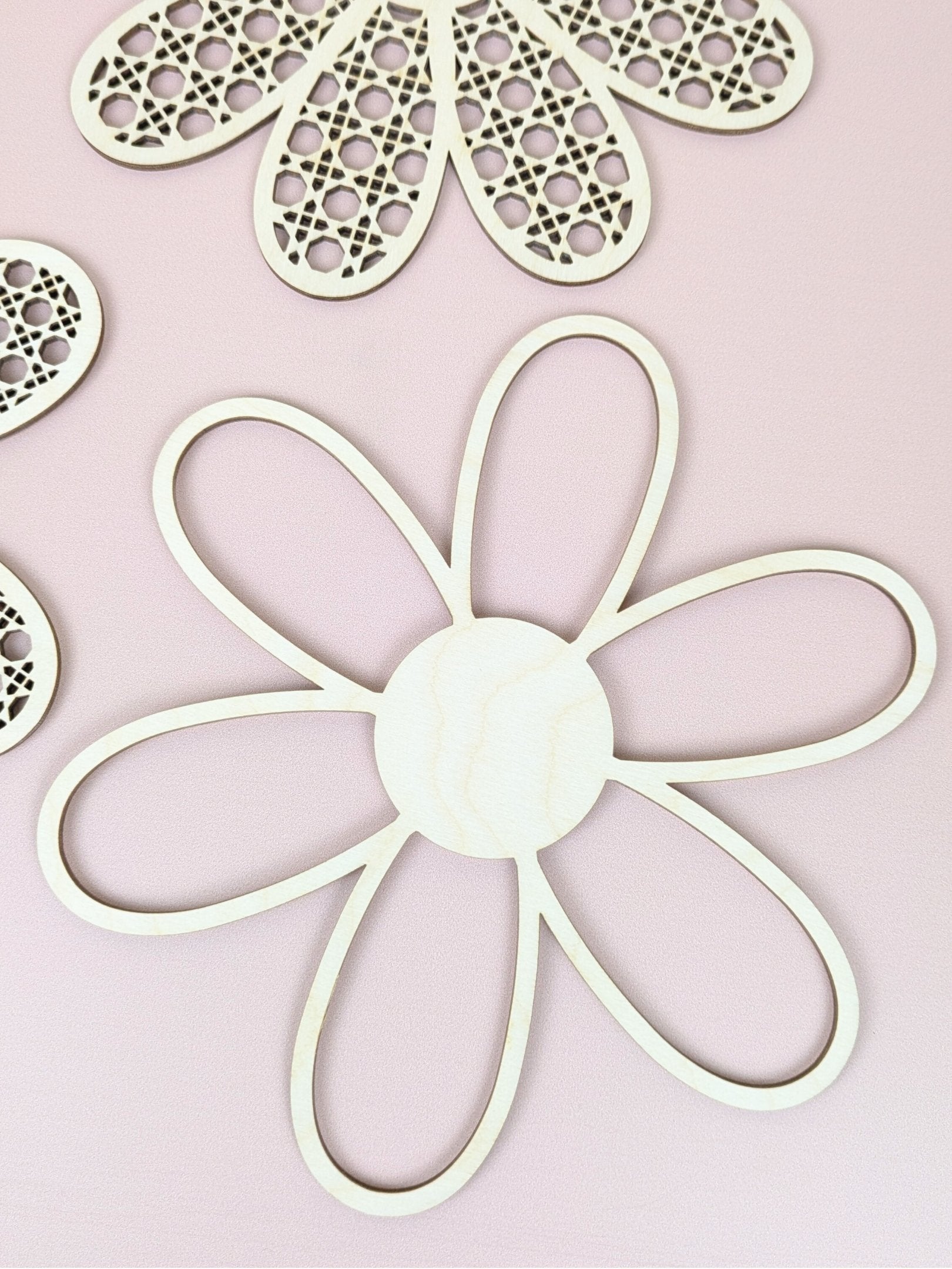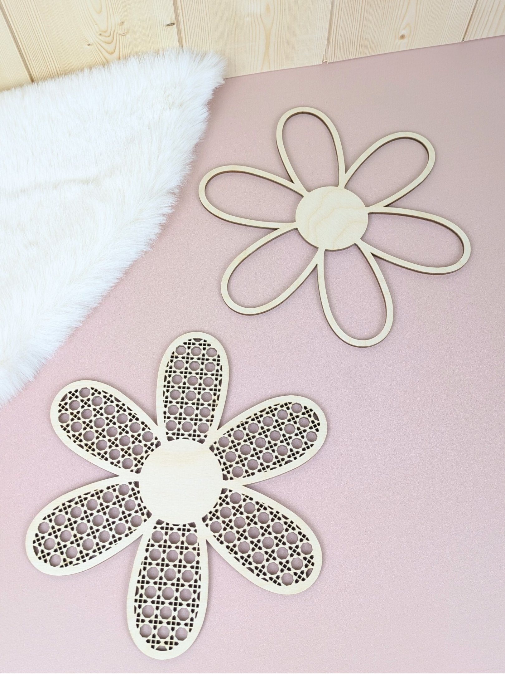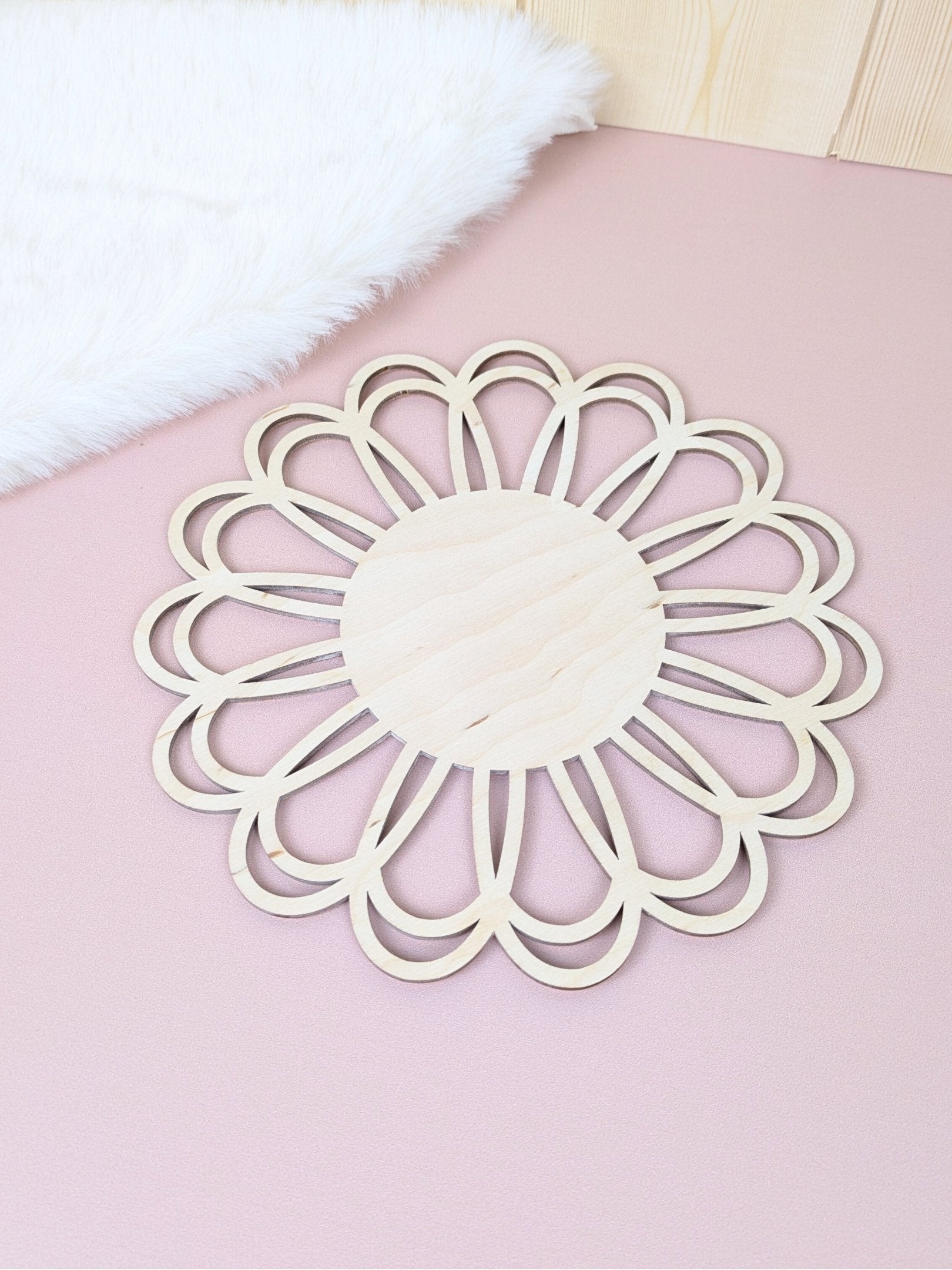 Le prénom est découpé dans une police écriture décorative, puis fixé sur une grande fleur en bois (plusieurs modèles disponibles).
